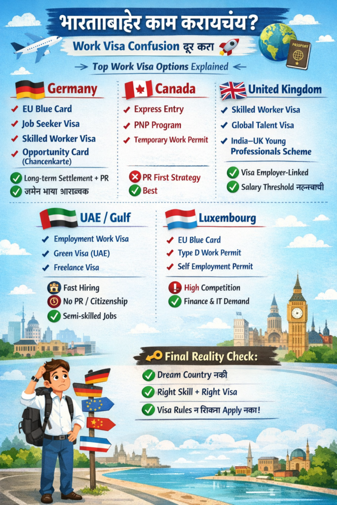 आजच्या या ब्लॉगमध्ये Germany, Canada, UK, UAE (Gulf) आणि Luxembourg या top destinations चे actual work visa options सोप्या भाषेत समजून घेऊया 👇