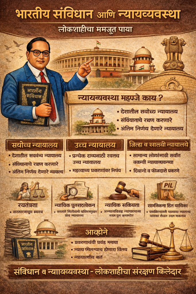 भारतीय लोकशाहीचे खरे बळ म्हणजे तिची न्यायव्यवस्था. डॉ. बाबासाहेब आंबेडकर यांनी तयार केलेल्या भारतीय संविधानात न्यायव्यवस्थेला स्वतंत्र आणि शक्तिशाली स्थान दिले आहे. यामुळे नागरिकांचे हक्क सुरक्षित राहतात आणि शासनावर नियंत्रण ठेवले जाते.
